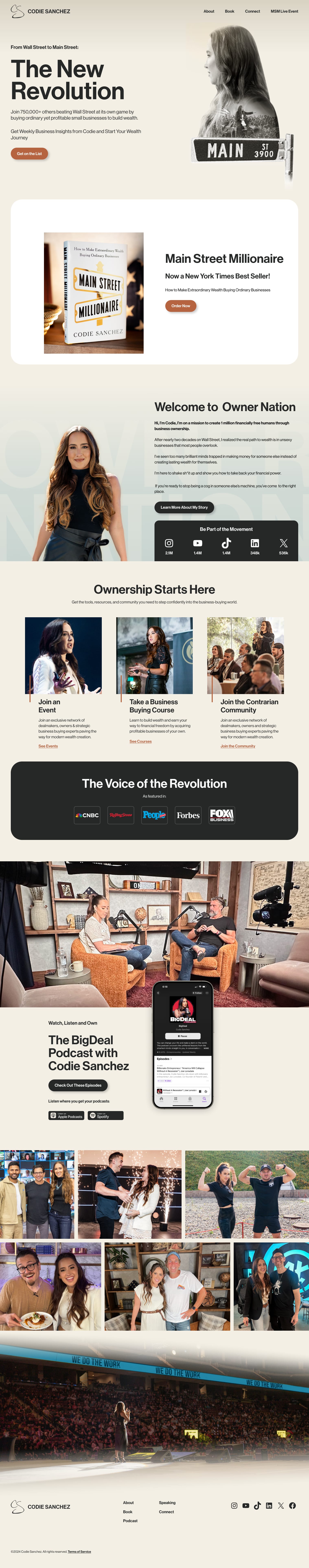 Here's a great example of a coaching business. Rumor has it it does $20m/year (even though I have met the owner once, I heard it get a shoutout on the My First Million podcast). You'll notice it's not the glossiest but there's absolutely TONS of social proof β show don't tell. Also it's so simple - sales page to calendar booking page. THAT'S IT. Simple sells, fancy fails. Do more of what works.